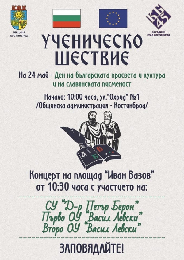 С ученическо шествие Община Костинброд ще отбележи Празника на българската просвета и култура и на славянската писменост - 24 май.