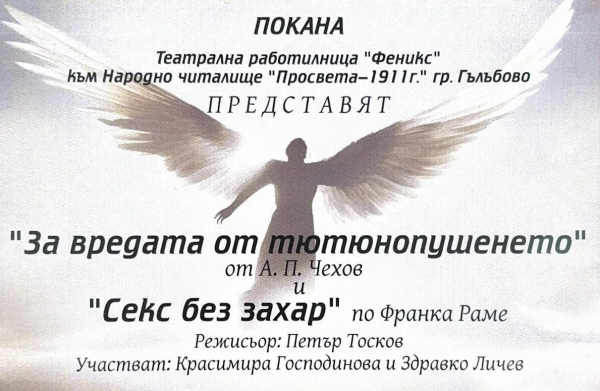 От 16:00 часа театрална работилница „Феникс“ към НЧ „Просвета – 1911“ (гр. Гълъбово) ще представи спектакъла „За вредата от тютюнопушенето“ и „Секс без захар“ по текстове на А. П. Чехов и Франка Раме. Под режисурата на Петър Тосков, постановката съчетава класика и съвременност с чувство за хумор и провокативен поглед към човешките взаимоотношения, страха и любовта.