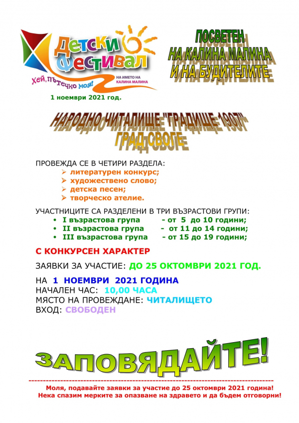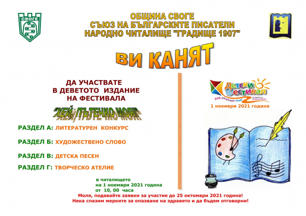 С деветото издание на детският фестивал на изкуствата „Хей, пътечко моя!“ и тази година в община Своге ще почете именитата Калина Малина и народните будители. Датата е 1 ноември 2021 г. Домакин ще бъде НЧ „Градище-1907“.