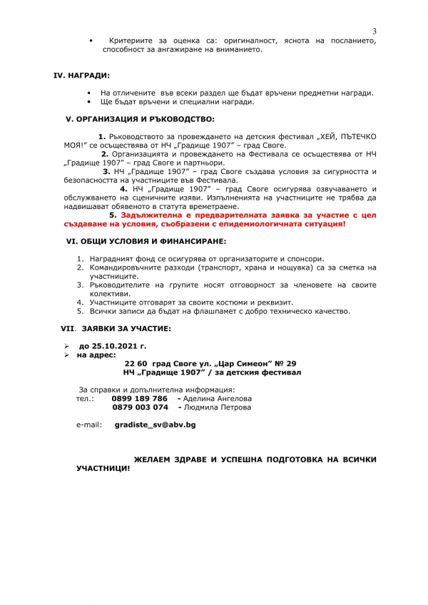 Заявки за участие се приемат до 25 октомври 2021 г. на адрес: 2260 гр. Своге, ул. „Цар Симеон” № 29, НЧ „Градище-1907“, за детския фестивал. На същия адрес до 20 октомври 2021 г. се изпращат творбите за участие в литературния конкурс. За справки и допълнителна информация: тел.: 0899 189 786; 0879 003 074; e-mail: liudmila.petrova@abv.bg; adelina_bojilova@abv.bg.