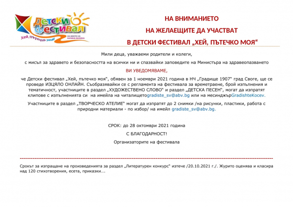 Детският фестивал „Хей, пътечко моя!“, обявен за 1 ноември в НЧ „Градище-1907“, ще се проведе изцяло онлайн. За това информират организаторите.