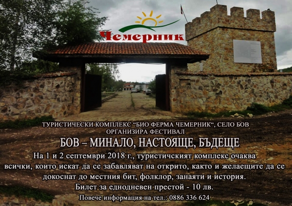 Двудневен фестивал „Бов – минало, настояще, бъдеще“ ще се проведе в с. Бов. На 1 и 2 септември, местният туристически комплекс „Био ферма Чемерник“ очаква всички, които желаят да се докоснат до характерните за района бит, фолклор, занаяти и история.