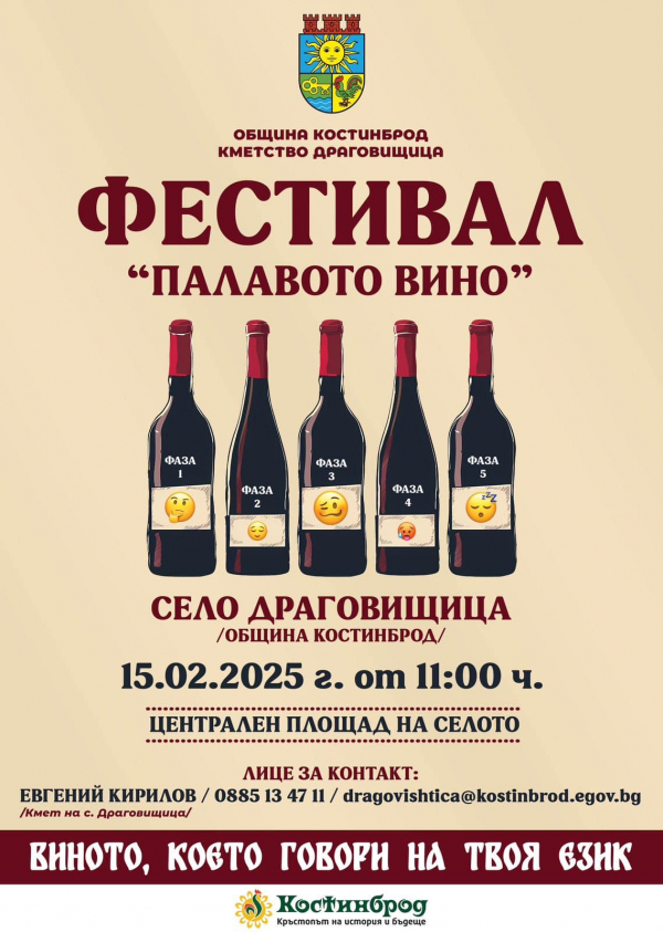 На 15 февруари, село Драговищица ще бъде сцена на пъстро събитие – фестивала „Палавото вино“. Организаторите от Община Костинброд и Кметство Драговищица канят всички любители на доброто вино и българските традиции на едно незабравимо преживяване, което ще съчетае аромати, вкусове и веселие.
