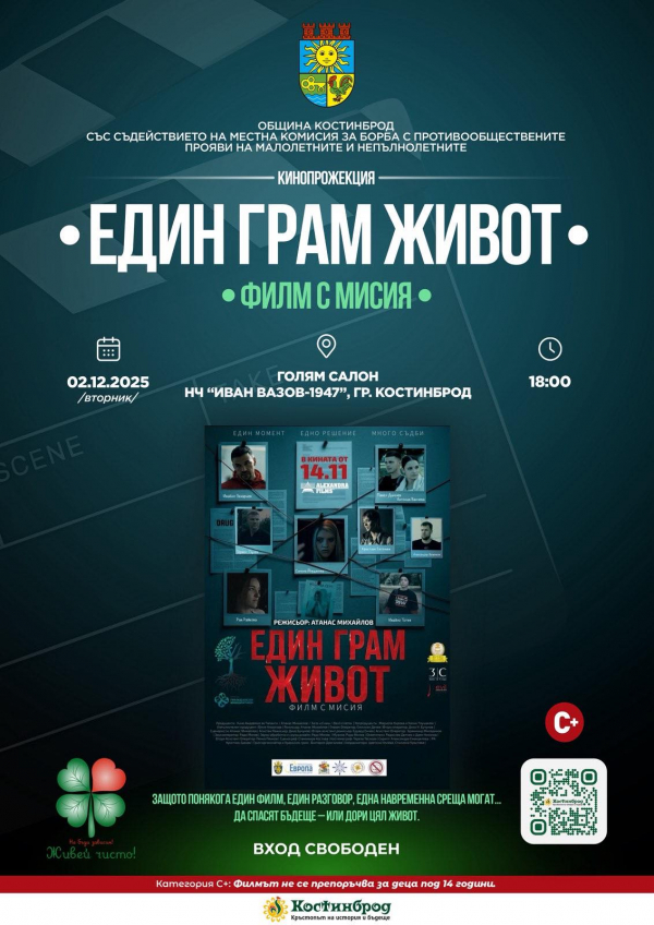 Община Костинброд и МКБППМН-Костинброд канят всички жители да изгледат филма напълно безплатно, като специалният фокус е насочен към деца над 14 години и родители на тийнейджъри. Защото понякога един филм, един разговор, една навременна среща могат да спасят бъдеще – или дори цял живот.