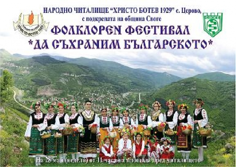 Традиционният фолклорен фестивал „Да съхраним българското” ще се проведе на 28 май (неделя) на площада пред Народно читалище „Христо Ботев 1929” в село Церово. Фестивалът е с начален час 11.00 ч. Всички гости на празника ще имат възможност да се насладят на фолклорни танцови и музикални изпълнения, да се потопят в народните обичаи и бит на нашите предци и да споделят приятни емоции.