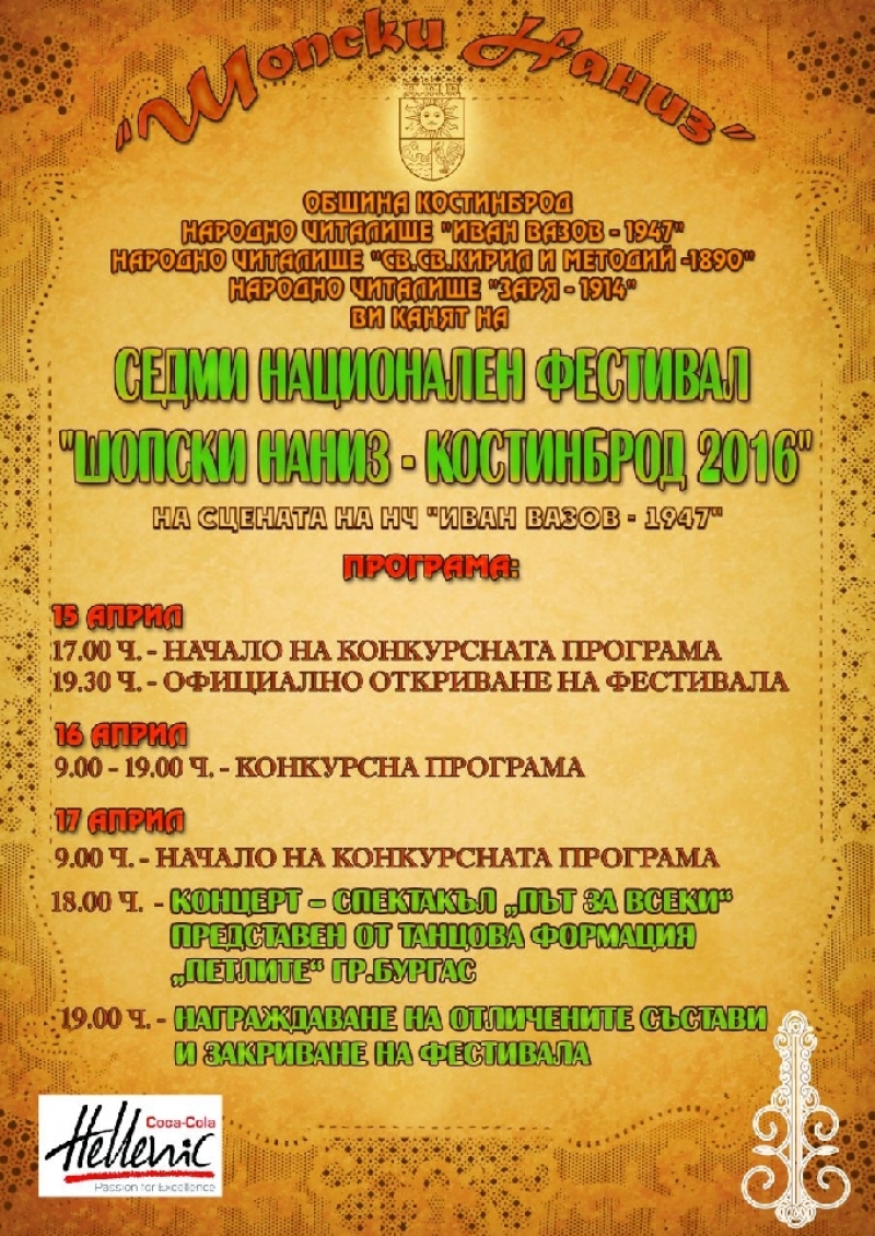 В Костинброд ще се проведе Седмият национален фестивал "Шопски наниз". Събитието ще се състои на 15, 16 и 17 април на сцената на НЧ "Иван Вазов - 1947", като негов организатор са община Костинброд, НЧ "Иван Вазов - 1947", НЧ "Св. Св. Кирил и Методий - 1890" и НЧ "Заря - 1914".