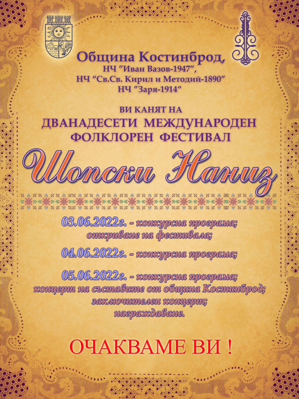 И тази година магията на фолклора ще завладее Костинброд с дванадесетото издание на фолклорния фестивал „Шопски наниз 2022“. Датите, в които града ще се потопи във фолклорни ритми са 3, 4, и 5 юни.