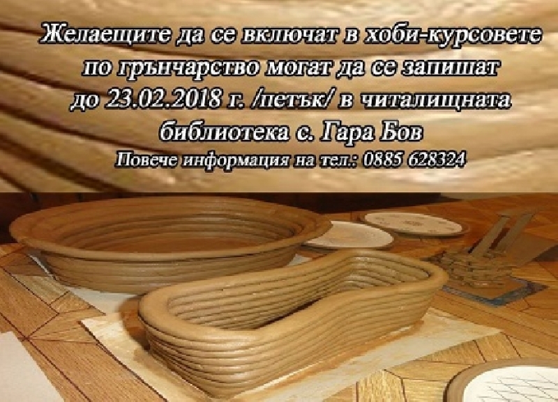 Неделното училище по грънчарство, което се превърна в една устойчива традиция за жителите и гостите на Бов, ще продължи своята работа и в последната седмица на месец февруари. Записванията на желаещите да се включат в хоби-курса по този традиционен занаят на 25.02.2018 г. и да проявят творческите си умения е до петък в читалищната библиотека на Гара Бов. Повече информация за курса и записване на тел. 0885 628 324.