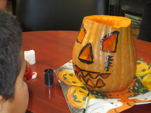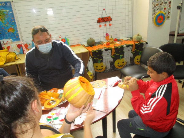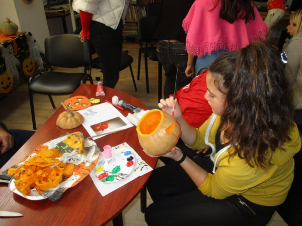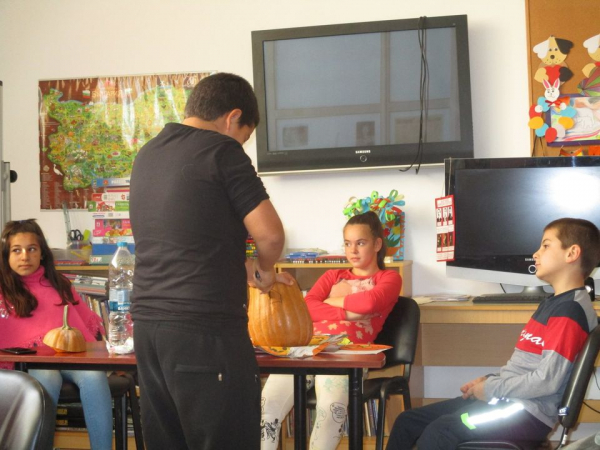 Децата разделени на два отбора с помощта на служители от центъра имаха за задача да издълбаят и декорират тиквени фенери.