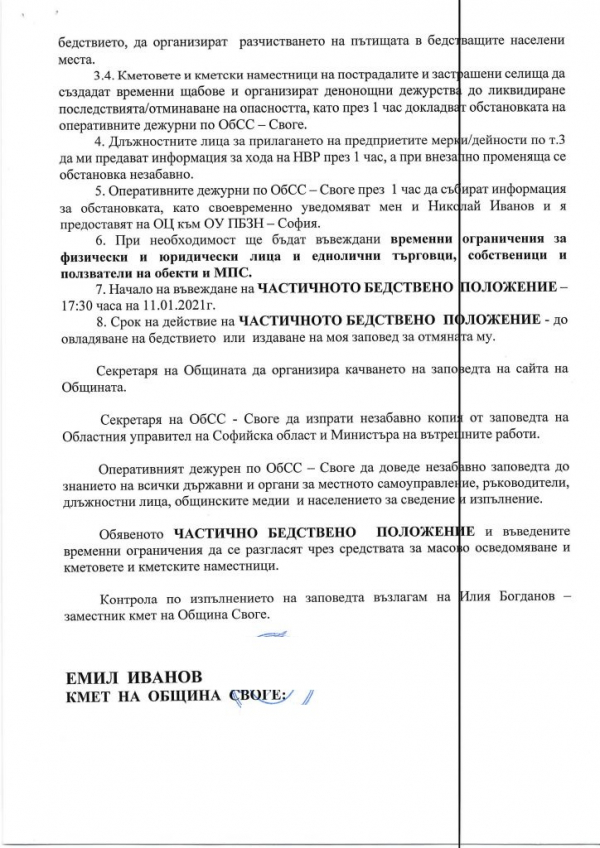 Със заповед на кмета Емил Иванов на територията на община Своге - град Своге, селата Владо Тричков, Свидня и Искрец е въведено частично бедствено положение. Заповедта е публикувана на официалния сайт на Общината: Ето какво гласи: