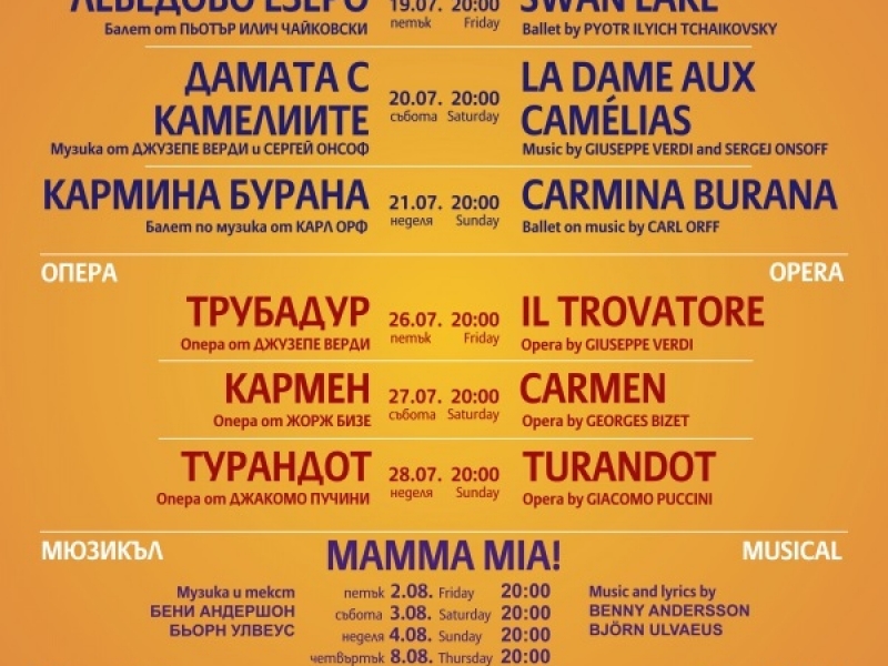 Четвъртото издание на фестивала ще бъде открито на 19 юли от 20:00 ч. с "Лебедово езеро" от Чайковски. Програмата продължава с трагичната любовна история "Дамата с камелиите", а спектакълът "Кармина Бурана" е най-новата продукция на Народния балет.