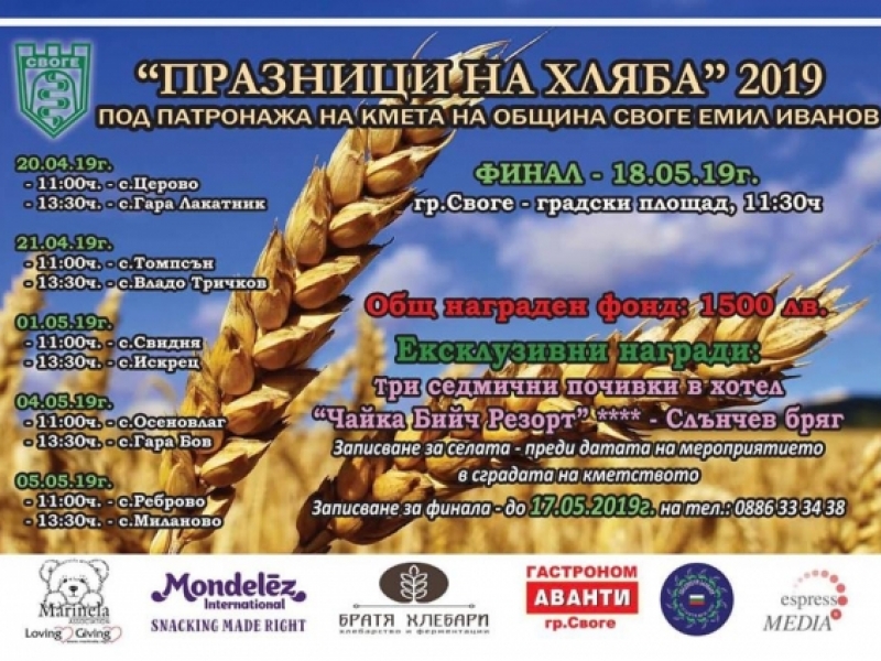 „Празници на хляба“ 2019 г. се осъществява с любезното съдействие на Сдружение „Маринела“, „Монделийз Интернешънъл“, „Братя хлебари“, Гастроном „Аванти“- гр. Своге, Сдружение „Обединени балкани“. Медиен партньор на събитието е EspressoNews.