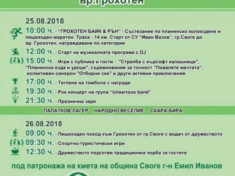 Традиционният събор ще бъде открит в неделя /26 август/ от 09:00 ч., с пешеходен поход към Грохотен от гр. Своге с водач от „Искърски пролом Своге“.