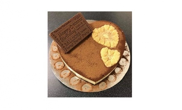 Разтворете пакетчетата куахада в 50 мл прясно мляко. В касерола сипете 300 мл.течна сметана, 300 мл прясно мляко и начупения на парчета 300 гр шоколад. Сложете касеролата на котлона и бъркайте до пълното разтопяване на шоколада с бъркалка за яйца, след това слаожете разбитата куахада и бъркайте още 2-3 мин. Изсипете сместа върху бисквитения блат. Оставете да изстине и сложете хладилника за цяла нощ. Декорирайте с какао и шоколадови сърца.