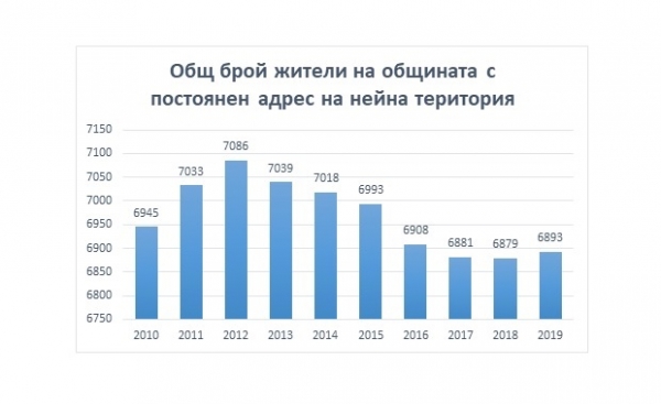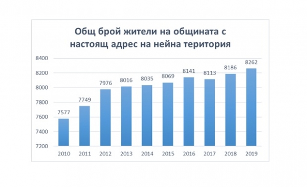 Втората диаграма показва постепенното нарастване на броя на жителите с настоящ адрес от 2010 г. до 2019 г. Тази тенденция се дължи на няколко фактора. Първият от тях е изискването за прием на дете в детска градина, за което в началото е бил необходим само настоящ адрес на поне единия от родителите на територията на общината (според новата наретба сега е нужна постоянна адресна регистрация). Друг фактор са социалните помощи, които също смениха законодателството си. Ако за получаване на помощи преди е бил задължителен постоянният адрес на човека, днес се зачита за валиден и само настоящ. От 2017 г. насам се предлага и еднократна сума от 300 лв. за новородено дете, което също е сред стимулите за смяна на адресната регистрация, например от софийска на божурска. Следващата предпоставка е провеждането на избори. Всяко лице може да заяви желанието си да гласува с настоящия си адрес, при което се заличава от изборния списък на постоянния си. Това улеснява човека да стигне до изборните урни и му дава възможността да взима активно участие в решаването на проблемите на общината. Отделът за „Административно обслужване и гражданска регистрация“, който издава удостоверения от регистъра за населението, също работи по-бързо и ефективно, поради по-малкия брой хора и липсата на чакащи на опашка.