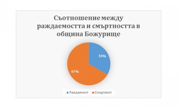 Въпреки множеството изброени благоприятни предпоставки и последвалия от тях непрекъснат поток от новозаселници – регистрирани и нерегистрирани, на преден план възниква още един проблем, свързан с отрицателния естествен прираст на населението. На кръговата диаграма ясно се вижда съотношението между раждаемостта и смъртността в общината през годините. А то е 1:2, или на 60 новородени на 1000 души от населението се падат 120 починали на 1000 души за една календарна година. Това негативно съотношение се запазва приблизително еднакво във времето.