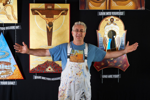Когато застанем пред една икона, ние винаги сме обърнати към Бога. Дали за молитва или за благодарност, или за прошка, но винаги гледната точка е насочена към Него. На мен ми хрумна идеята, че мога да направя икона, която да ни провокира да погледнем към себе си пред очите на Господ. В живота си често сме изправени пред избор как да постъпим, кое или какво да изберем. Имаме свободна воля да последваме съвестта си или пък да се изкушим. Именно това за мен беше интересно - какво ще видим ако се огледаме пред Бога? Да погледнем навътре в себе си и да си зададем най-важните и същевременно най-личните въпроси. Така се „роди“ идеята за икона с огледало, а след нея и всички останали в инсталацията. Всяка от иконите е свързана с определен въпрос: „Към какво се стремиш?“, „От какво се страхуваш?“, „За какво мечтаеш?“, „В какво вярваш?“ Всички те са обединени от централния и най-важен въпрос - „Кой си ти?“