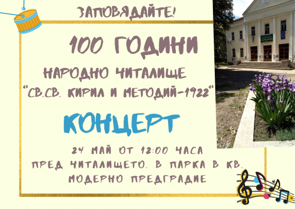 На пътя за Европа и на булевард Европа, сгушено в китен парк в квартал Модерно предградие НЧ „Св.св. Кирил и Методий - 1922“ живее вече 100 години. През годините читалището е отваряло вратите си за всички желаещи да пеят, танцуват, рисуват, свирят или просто да си вземат книжка да прочетат. Решихме да отбележим празника с концерт, на който да се изявят нашите любители и гости, съобщават от читалището.