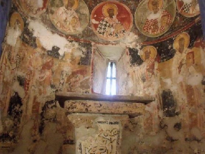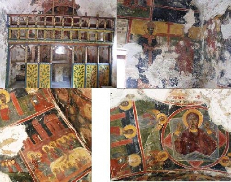 Отвътре цялата черква е била изписана, днес са запазени значителни фрагменти. На свода е сравнително добре запазено изображение на Богородица. Едно изключително изпълнение на Тайната вечеря. Отляво са Св. св. Константин и Елена. До тях на северната стена има само малки частици от стенопис, разрушен от влагата. На южната стена има други добре запазени сцени, които обаче не разпознавам. Вътре в олтара има добре запазени фрески. Олтарният камък е изписан с декоративни мотиви. На апсидата има традиционна Богородица Ширшая Небес и фриз с медальони на светци, а под тях - свети отци. Над олтара се намира почти неразпознаваемо изображение на Исус Христос. Най-добре запазените стенописи заемат един участък от свода над южната стена, долепен до западната.