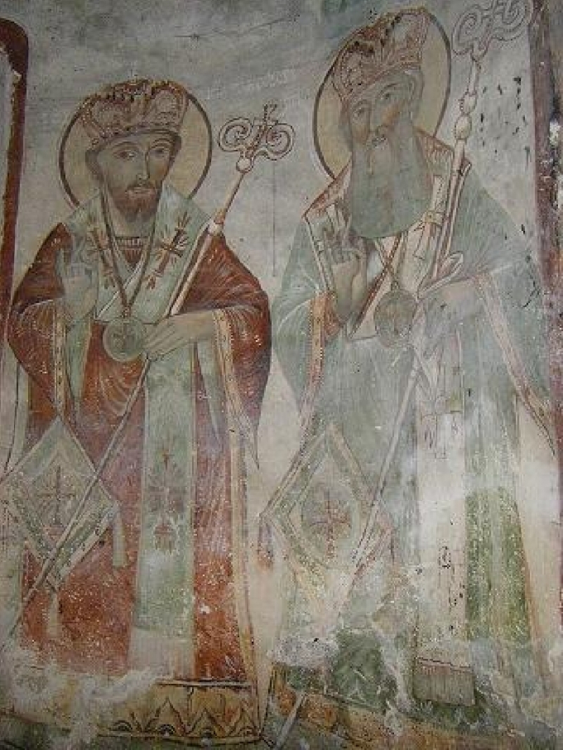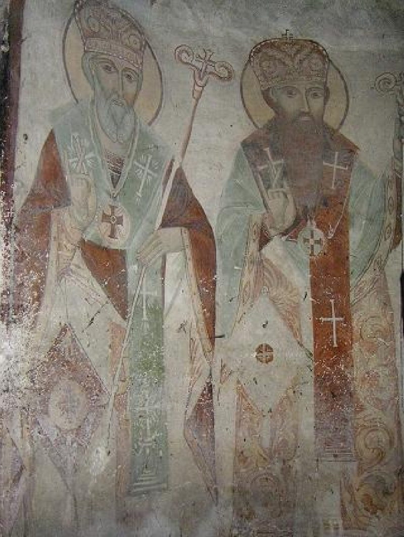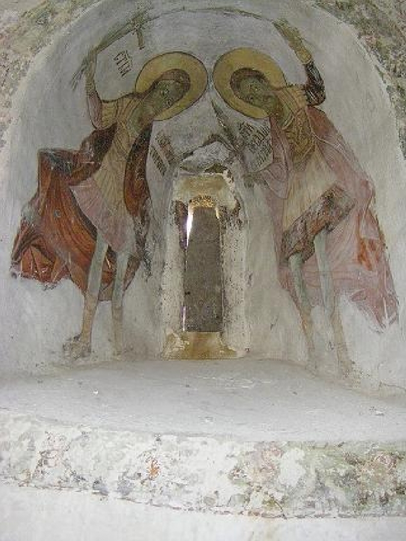 Тези стенописи не представляват голямо художествено постижение, защото са дело на слабо школуван образописец, но са точно отражение на традиционно възприетите сюжети и типажи. На върха на свода, в голям медальон, е изобразен св. Йоан Кръстител. При него се чете надпис: ,,Ктитор Тона Тошев от с. Габер Тошо Стоянка 1880". В други медальони са нарисувани свещи и пророци. На западната стена на нартиката е изографисан ,,Страшният съд", а на източната - отделни фигури и композиции. Отляво на вратата е Архангел Гавраил, а отдясно - Архангел Михаил. Над тях са композициите ,,Адам и Ева", , "Изгонването от Рая", ,,Праведно и грешно изповедание". Над тях следват ,,Митарствата", които продължават и по раменете на свода. По подпорите на нартиката са изобразени прави фигури, между които се откроява св. Христофор с кучешка глава. Изобразен е върху светлосин фон с нимб в охра. Животинската му глава и мантията са кафяви, а ризницата, туниката и панталоните - сини. Чизмите са жълти. Живописецът предпочита да използва контрастни основи и сурови, но пък носещи ефект цветове. Върху стенописа се чете следния текст: ,,С в. Великомъченик Христофор: ктитор Тоно Тошев от с. Габер Стоянка Наста Маца Руса Вела Пека Сокол Станойка Гина: покой Гора Таша Манолко Иванка: 1881 г."
