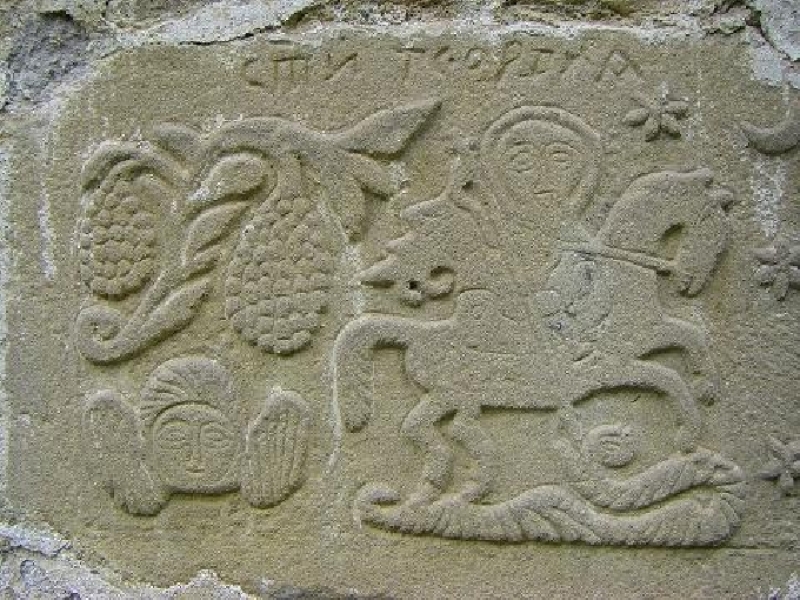 Вляво на вратата е взидан камък с плитък релеф, с изображение на св, Георги. Светецът е на кон, проницаващ с копие змей. Релефът е разкрасен с растителни мотиви, небесни светила и ангелче. Зад конника е разположена клонка с два плода, приличащи на гроздове, а под нея - ангелче. Пред конника е изображението на три звезди, с луна в първа четвърт. Над релефа е издълбан надпис: сти георгия. Вдясно от вратата има аналогичен релеф, с изображение на св. Димитър. Светецът е на кон, с издигнато във въздуха копие. Пред конника са изобразени клонки с плод (грозд) и слънце, а зад него също клонки с плодове. Над релефът е надписът: сти димитрия. На един ъглов камък, на югоизточния ъгъл на църквата, на височина 4 метра e изобразена човешка фигура - млад мъж в народна носия, с нимб на главата. Ръцете му са вдигнати настрани, като в дясната държи кръст, а в лявата диск - розета (пита, слънце). Тази смесица от светски и религиозни белези в изображението, вероятно, има за цел да ни накара да го възприемаме като ,,пазител" на черквата. Релефи със символно съдържание има и върху каменния праг над западната врата. Изображенията са на двуглав орел, феникс и алконис. Над тези релефи, отдясно на иконата - патрон е изобразен шестокрил херувим като пазител на църквата. Между крилата му се подава дълга сабя. Изображението на алкониса е представено като птица с човешка глава, заобиколена с нимб. В устата си държи дръжката на голяма розета. Друга такава розета държи и в краката си. Главата на феникса е с две рогчета и също е заобиколена от нимб. Прави впечатление, че изображенията от тези каменни релефи и тези от дърворезбованите олтарни двери са сходни, както и по отношение на композиция, стил, мотиви, така и като тематично изпълнение. Това навежда на мисълта, че майсторът-резбар е близък до групата, която е изрязала каменните релефи. Предполага се, че е бил един и същ майстор.