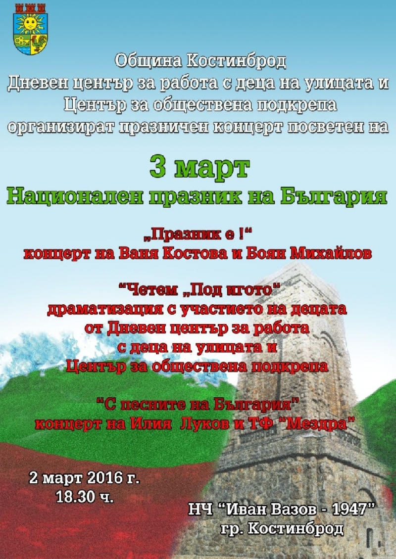 Община Костинброд, Дневен център за работа с деца на улицата и Център за обществена подкрепа организират празничен концерт посветен на Националния празник на Република България - Трети март.