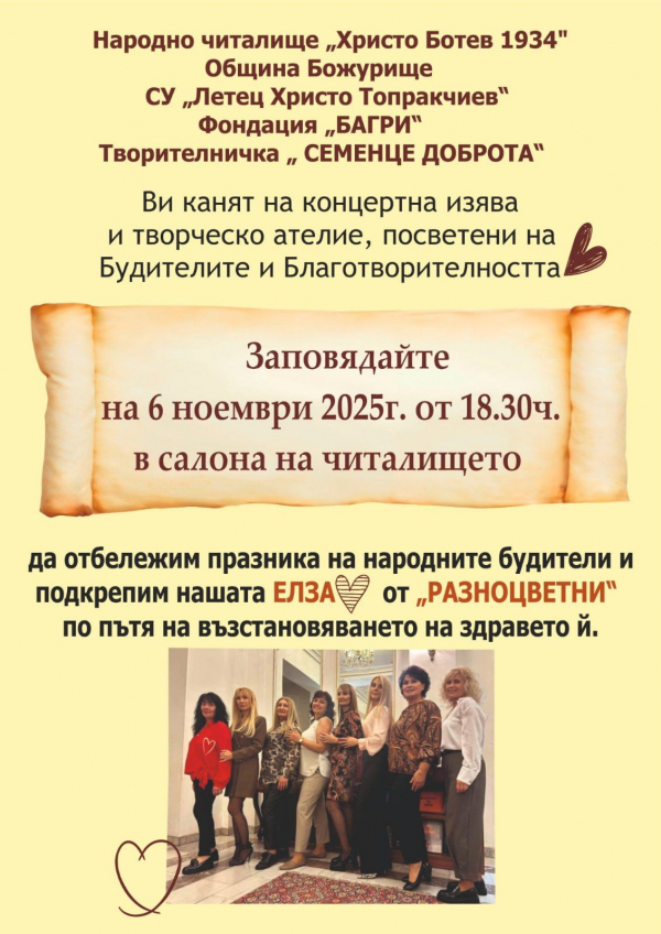На 6 ноември 2025 г. от 18:30 ч. в салона на Народно читалище „Христо Ботев – 1934“ ще се проведе концертна изява и творческо ателие, организирани от читалището, Община Божурище, СУ „Летец Христо Топракчиев“, Фондация „Багри“ и Творителничка „Семенце доброта“.