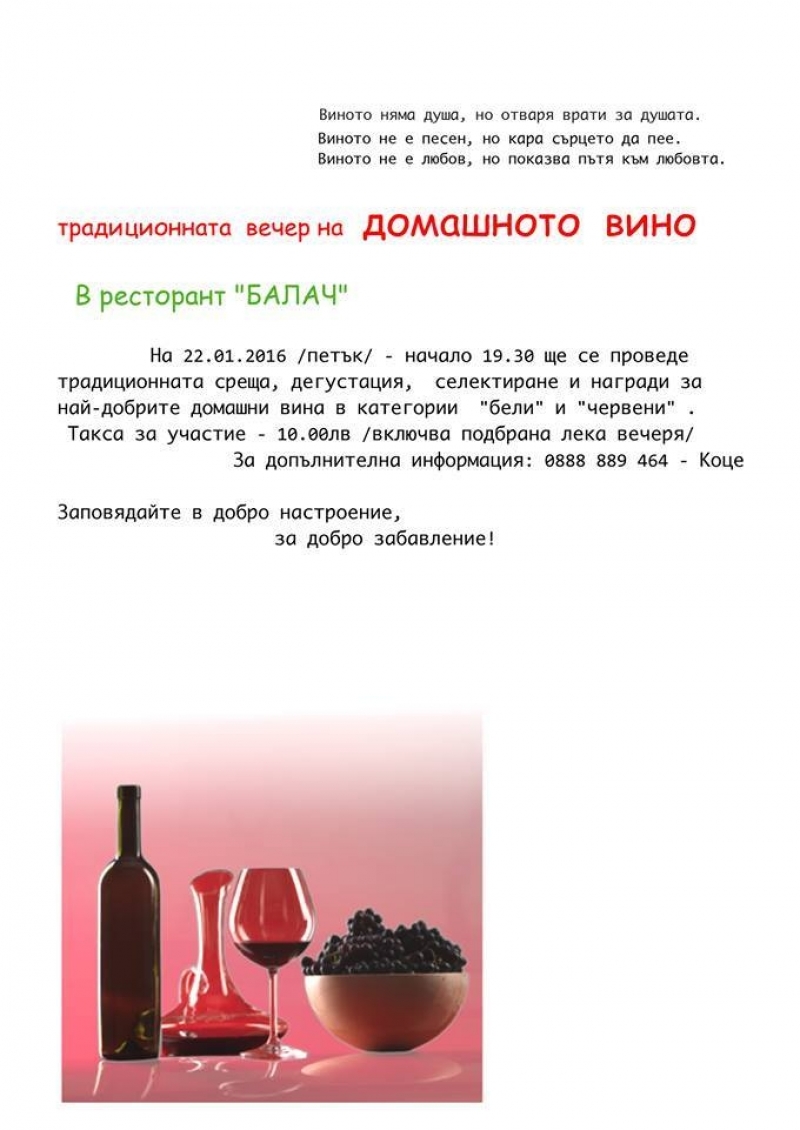 На 22 януари от 19:30 часа ще се проведе традиционната среща, дегустация, селектиране и награди за най-добрите домашни вина в категории "бели" и "червени".