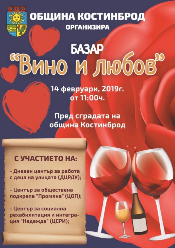 Събитието е под надслов „Вино и любов“, като деца и възрастни от социалните институции ще представят и предложат на гражданите изработени от тях произведения, посветени на любовта и виното, пред сградата на общината в града.