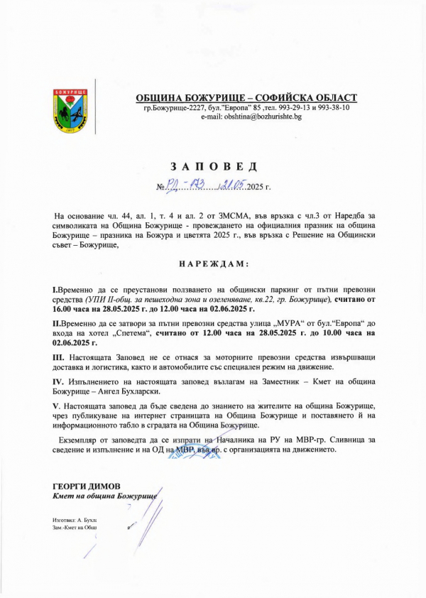 Съгласно заповед № РД-13/21.05.2025 г., в периода от 16:00 ч. на 28 май 2025 г. до 12:00 ч. на 2 юни 2025 г. се преустановява използването на общински паркинг в зона УПИ II-общ. (пешеходна зона и озеленяване, кв. 22, гр. Божурище). Също така се затваря за движение улица „Мura“ от бул. „Европа“ до входа на хотел „Спетема“ в периода от 12:00 ч. на 28 май до 10:00 ч. на 2 юни 2025 г.