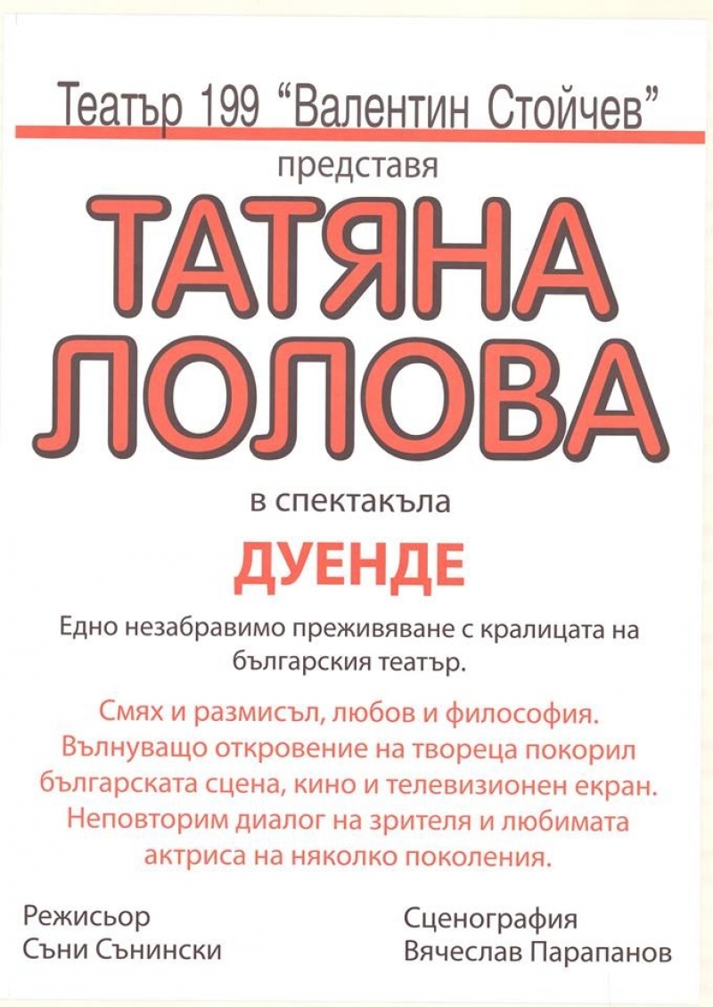 На 1 декември, вторник, от 19 ч., в салона на НЧ "Христо Ботев 1934" - Божурище ще бъде поставена пиесата "Дуенде" със специалното участие на театралната легенда Татяна Лолова.