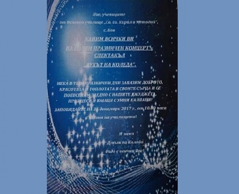 Учениците от ОУ „Св. Св. Кирил и Методий“ с. Бов, организират голям празничен концерт-спектакъл под надслов „Духът на Коледа“.