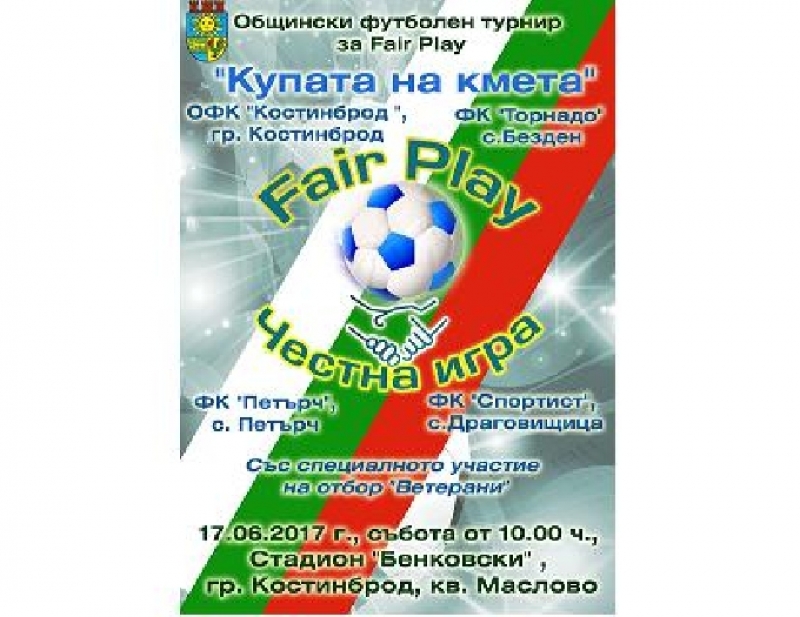 Общински футболен турнир за „Купата на кмета” ще се проведе на 17 юни на стадион „Бенковски” кв. Маслово в Костинброд. Началният час на срещите е 10:00 часа. В спортното надпревара ще се включат отборите на ОФК „Костинброд”, ФК „Торнадо” село Безден, ФК „Петърч” село Петърч, ФК „Спортист” село Драговищица. Специалното участие в турнира ще вземе отбор „Ветерани”.