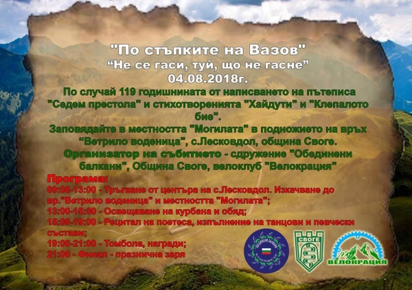 Фестивал „По стъпките на Вазов” по случай 119 годишнината от написването на пътеписа „Седем престола” и стихотворенията „Хайдути” и „Клепалото бие” организират сдружение „Обединени балкани”, Община Своге и велоклуб „Велокрация”.