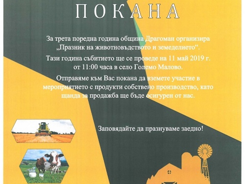За трета поредна година „Празник на животновъдството и земеделието” ще събере земеделци и животновъди в с. Големо Малово, община Драгоман. Проявата, която вече се утвърди като едно от най-мащабните агро-еко изложения в региона на запад от София, ще се проведе на 11 май /събота/ от 11:00 ч.