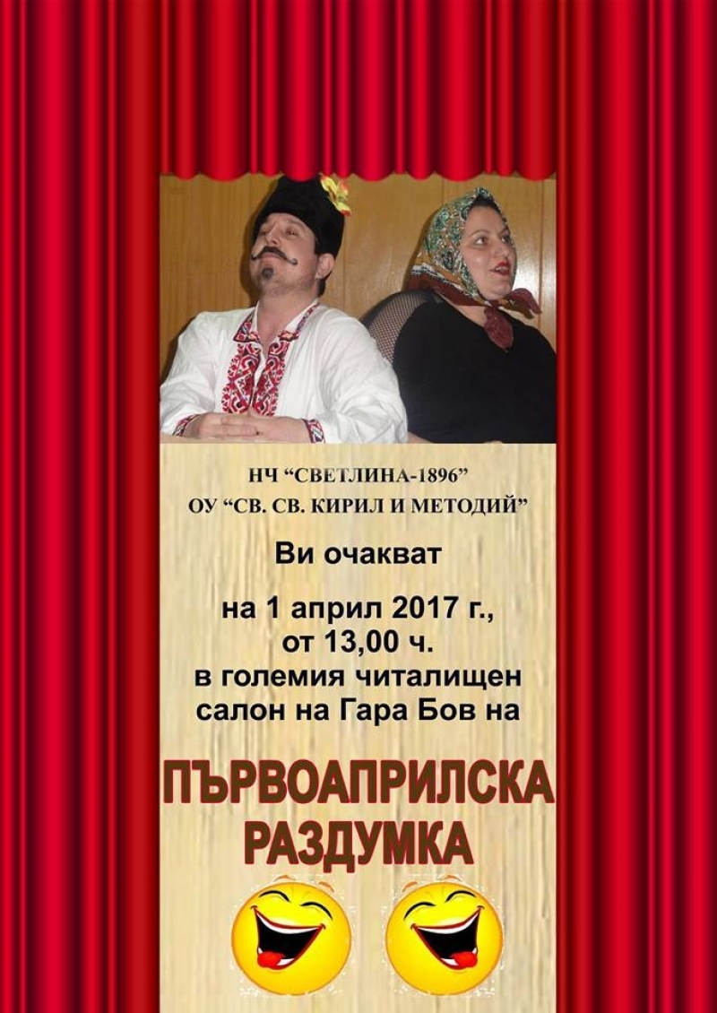 На първоаприлска раздумка кани НЧ "Светлина - 1896" и ОУ "Св. Св. Кирил и Методий" в Гара Бов, по повод деня на хумора сатирата и забавата. Жителите и гостите на двете китни селища в Искърското дефиле могат да се посмеят и изпълнят с добро настроение на първи април от 13.30 часа в големия салон на читалището в Гара Бов.
