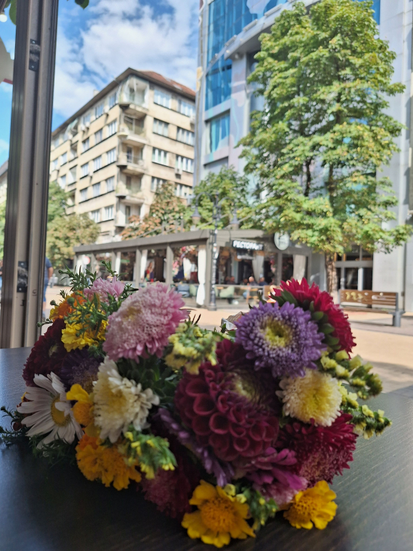 Отново у дома, той поставя току-що купения цветен букет на перваза на прозореца с гледка към отсрещния панелен блок. Има необясним чар в съчетанието между приветливите цветове на букета и сивите тонове на панелката. Мисълта ражда нова усмивка на лицето на доволния софиянец. Най-широката за деня. Истински, пълноценен празник.