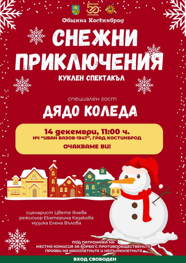 Община Костинброд кани своите малки и големи жители на вълшебно зимно изживяване – куклен спектакъл „Снежни приключения“. Събитието ще се състои на 14 декември от 11.00 ч. в НЧ „Иван Вазов 1947“, гр. Костинброд. Входът е свободен!