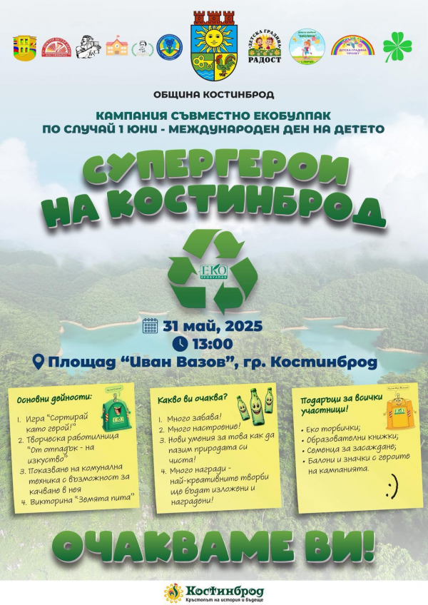 По случай 1 юни – Деня на детето, Община Костинброд, съвместно с „Еко Булпак“, училищата и детските градини в общината, организират забавна и образователна инициатива за най-малките защитници на природата. Събитието ще се проведе на 31 май (събота) от 13:00 часа на площад „Иван Вазов“ в Костинброд. Община Костинброд кани всички малки супергерои да се включат в мисията за по-чиста и по-зелена община!