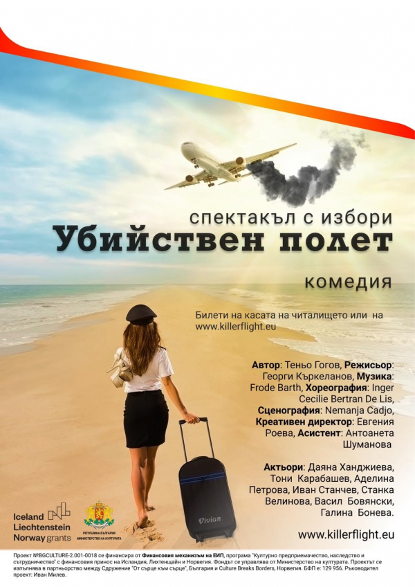 Иновативният театрален комедиен спектакъл „Убийствен полет - спектакъл с избори“ ще бъде представен пред публика в Костинборд, на 15 октомври от 19:00 ч., в НЧ „Иван Вазов-1947” - голям салон.