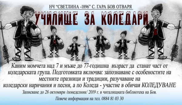 Всички момчета над 7 и мъже до 77-годишна възраст, които искат да станат част от бовската коледарска дружина, могат да се запишат за участие в инициативата до 28 октомври /понеделник/ 2019 г. в читалищната библиотека в Бов. Повече информация може да бъде получена на тел.: 0884 810 330.
