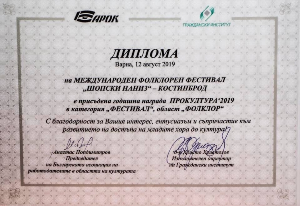 За носител на наградата за Международен фолклорен фестивал за 2019 година, Комитетът по номинациите определи, в област „Фолклор“ - „Шопски наниз - Костинброд“.