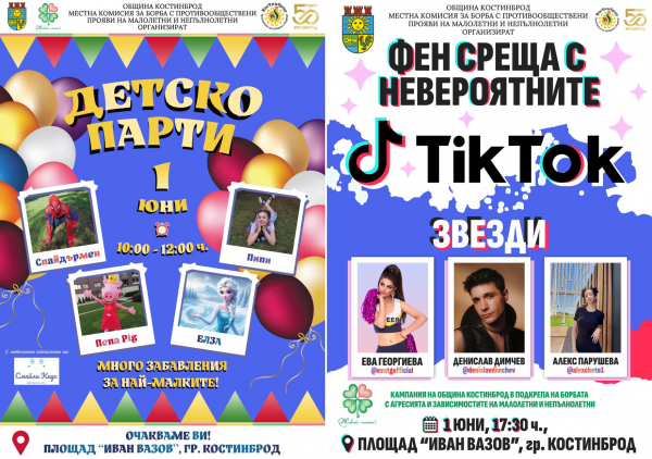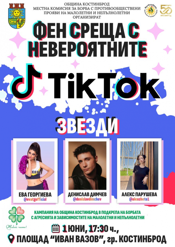 Община Костинброд ще зарадва и своите тийнейджърите в общината. На 1 юни, в града ще гостуват Тик Ток звездите Ева, Дени и Алексчето! Срещата ще се състои от 17.30 ч. на площад „Иван Вазов“.