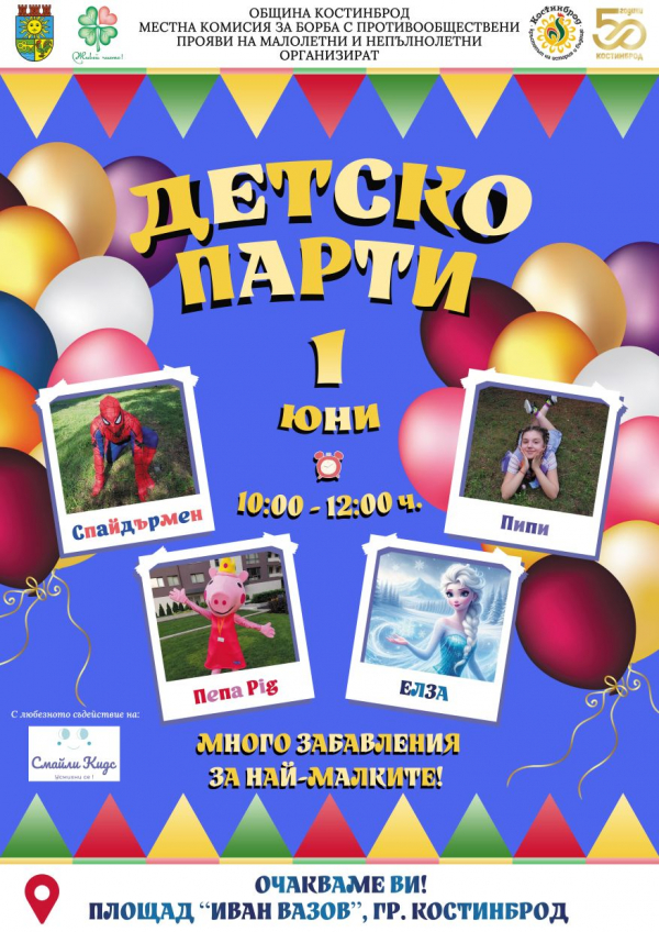 Весели игри, смях и много изненади очакват най-малките жители на община Костинброд, за 1 юни. За всички деца на възраст от 1 г. до 7 г., МКБППМН-Костинброд и Общинска администрация-Костинброд организират детска забава с агенция „Смайли кидс“. Празникът ще започне в 10.00 ч. на 1 юни – Деня на детето, на площад „Иван Вазов“, в Костинброд.