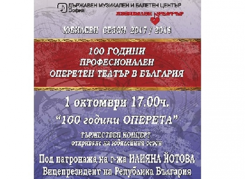 Музикалният театър открива новия си сезон днес - в Световният ден на музиката, с концерт –спектакъл по повод стотния юбилей на професионалната оперета в България. На сцената на Държавния музикален и балетен център ще излязат 140 души – солисти, оркестър, хор и балет, за да отдадат почит на първосъздателите на българската оперетата на поколенията творци преди тях. Те ще изпълнят откъси от първите спектакли, поставени в началото на миналия век от деветте частни оперетни театъра, първи разпространили оперетното изкуство в България с риск да скандализират тогавашните патриархални нрави.Зрителите ще видят откъс от рядко поставяната оперета „Маркиз Бонели” от Делингер, играна пред столичани в театъра на Ангел Сладкаров на 10-ти февруари 1918 година – рождената дата на българската професионална оперета. Тази оперета не е била поставяна в България отпреди 100 години, по думите на режисьора проф. Светозар Донев.