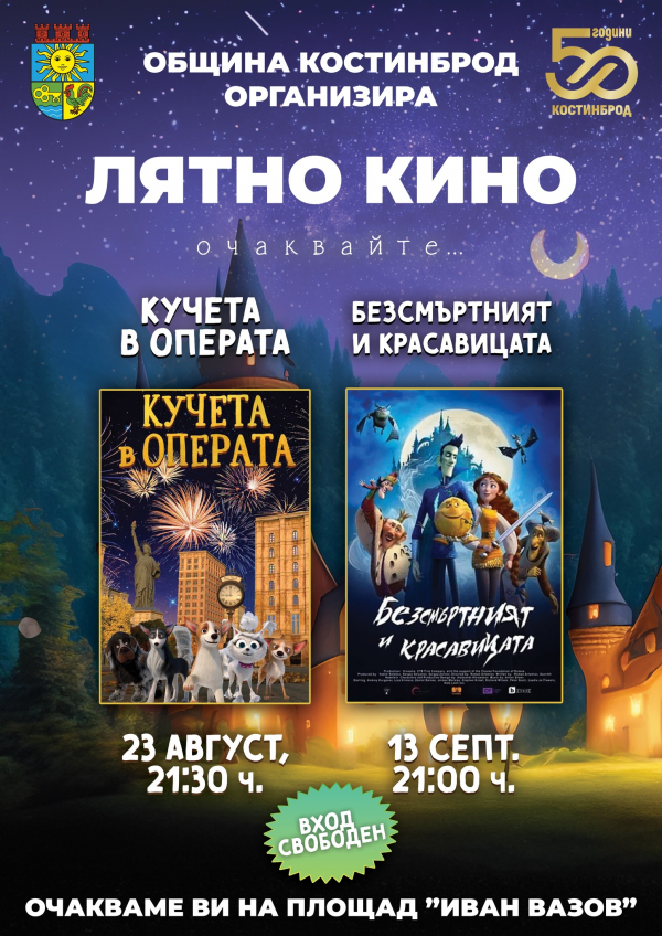 Община Костинброд организира летни кино вечери за най-малките си жители и техните семейства. На 23 август, от 21.30 часа на площад „Иван Вазов“, малките зрители ще могат да се насладят на анимацията „Кучета в операта“.