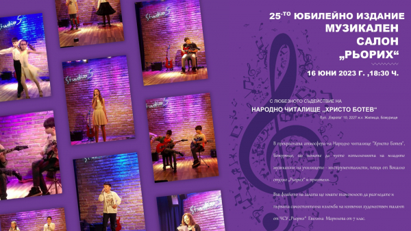 25-тото издание на Музикален салон „Рьорих“ ще се проведе в Божурище. Домакин на форума за изкуства ще бъде НЧ „Христо Ботев“. Събитието ще се проведе на 16 юни /петък/ от 18.30 ч. В прекрасната атмосфера на читалището, присъстващите ще имат възможността да се насладят на изпълненията на младите музиканти на училище „Рьорих“ – инструменталисти, певците от Вокално студио „Рьорих“ и приятели.
