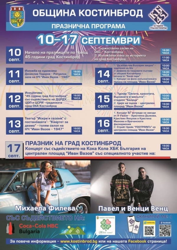 На 17 септември Костинброд чества 45 години от обявяването си за град. Празникът и тази година ще бъде отбелязан с богата едноседмична програма, организирана от Община Костинброд.