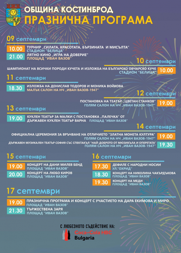 От 9 до 17 септември, жители и гости на Костинброд ще имат възможността да се насладят на множество събития и забавления, сред които: лятно кино, театър за малки и големи, шампионат за всички породи кучета, спортен турнир, изложби, дефиле с народни носии, музикален спектакъл и концерти с участието на Дани Милев Бенд, Любо Киров, Николина Чакърдъкова, Меди, Дара Екимова и Миро.