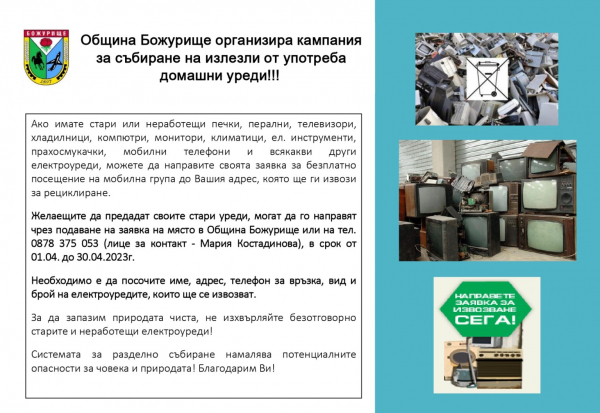 Община Божурище организира кампания за събиране на излезли от употреба домашни уреди. Желаещите да предадат своите стари уреди, могат да го направят чрез подаване на заявка на място в Община Божурище или на тел. 0878 375 053 (лице за контакт – Мария Костадинова), в срок от 01.04. до 30.04.2023 г. Необходимо е да бъдат посочени име, адрес, телефон за връзка, вид и брой на електроуредите, които ще се извозват.